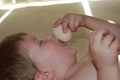 Today Sam made a new friend.. 'Mr Egg' (or 'Sam' as he sometimes called him)... he spent the morning taking Mr Egg for rides on the bike, putting him in bed and tucking him in, kissing him and walking around holding him gently. Unfortunately, by the end of the morning Mr Egg had a bit of an accident and had to go 'on holiday' to get fixed up. There were tears from Sam who said farewell to his little friend, with the promise that he will come back soon for another play :)