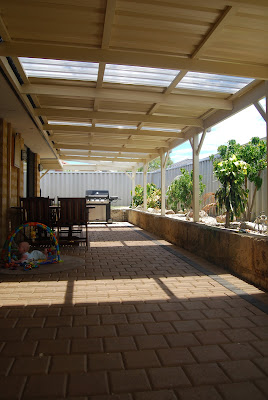 Next task of the day - tidy up the patio area while Jacob supervises. I meant to post a completed patio picture a long time ago.. so here it is :)