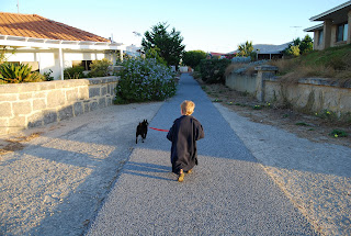 On the way home, Sam walking Dad's dog Skip. Sam accidentally (or so he says) fell into the water so had to wear Dad's jacket home.