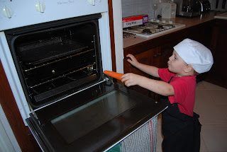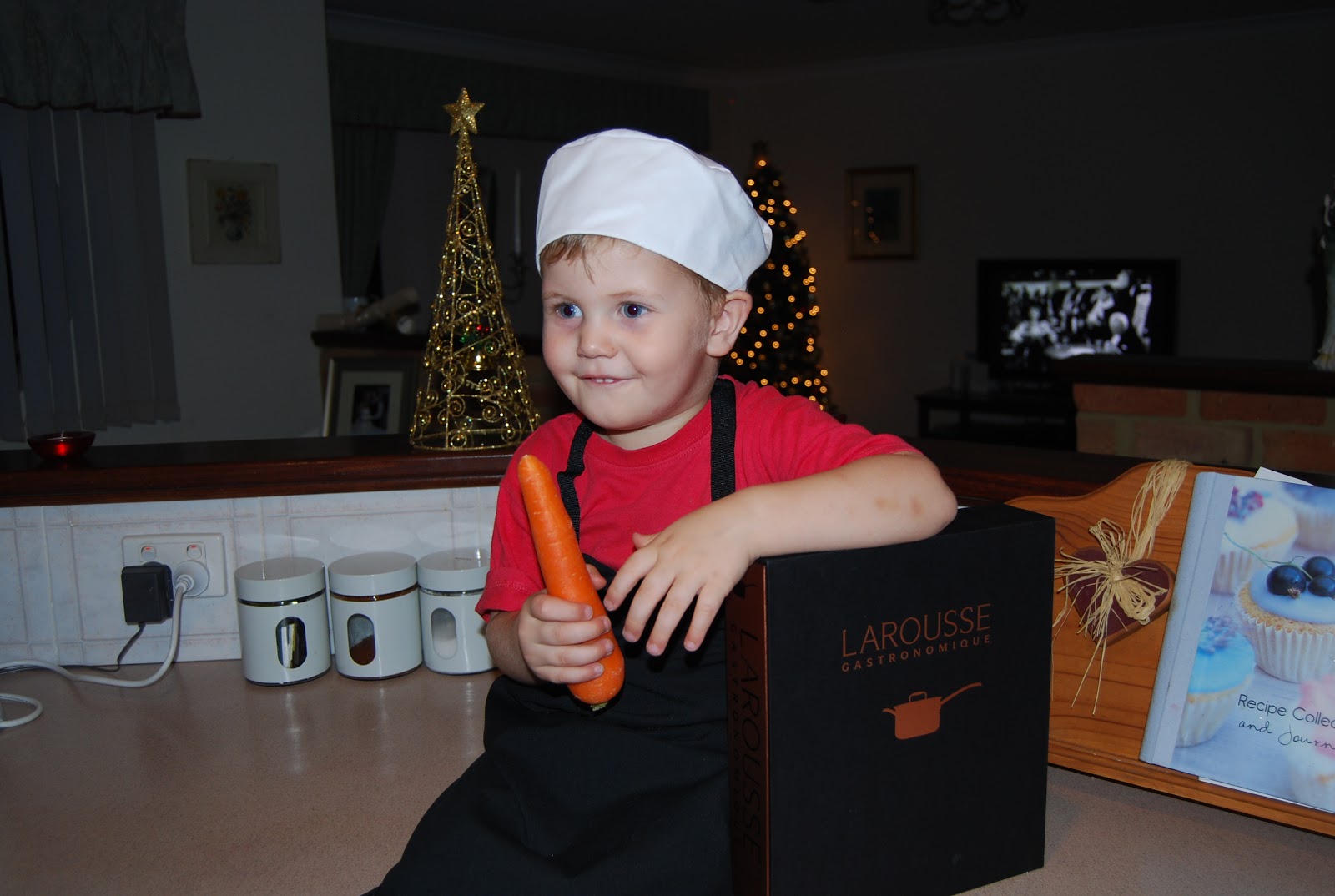 Sam helping Nanna in the kitchen, of course you must wear an apron and chef's hat to do this...