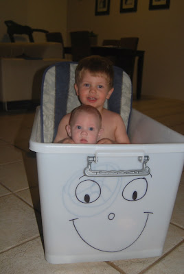 This morning we used one of our storage containers and made it into a car... Sam thought it was fantastic, he spent some time making it comfortable so Jacob could ride in it too and his toys also got taken for a ride too:)