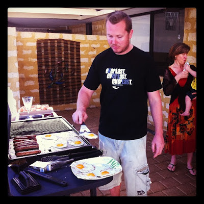 Breakfast time! Lewy was in charge of the bacon, eggs and sausages on the BBQ, and Sharon and I were in charge of flipping pancakes in the kitchen.