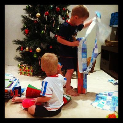 Watching Sam this morning was a real treat for us. His excitement was contagious :) I tried to take a few snaps of him opening his presents, but he was a blur in all of them as he was moving around so fast and ripping that paper so quickly, the camera couldn't keep up :P