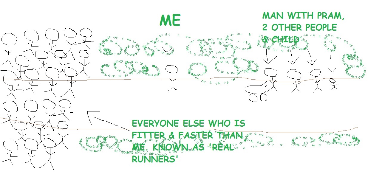 2 seconds later I look behind me. This is a little drawing of what my mind tells me is happening in the race. (Probably not an ACCURATE assumption but not far off!). I tell myself if I can't run faster than a man with a pram then there is a serious problem here!