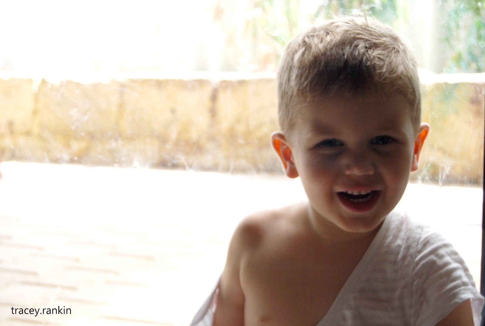 The first thing Sam did when we got home was strip off all his clothes. Then he put one of my tops to wear so we had an impromptu little photo session. Note to self: Clean your windows before you take photos in front of them!