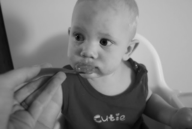 Jacob is doing really well starting solids, so far he seems to like anything and everything I offer him... he really is such a dream! Notice the little tear .. this tear was caused by hunger, and me not getting the food to him quick enough!