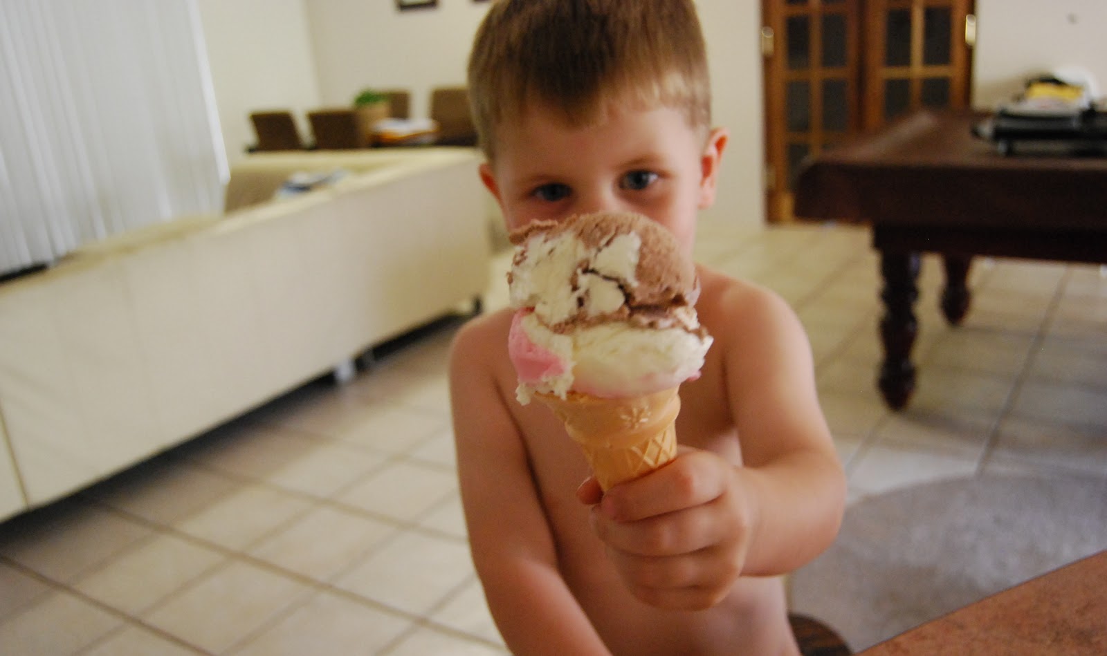 Sam was a big help with the kitchen... so his reward was an ice-cream (and I rewarded myself too.. :) Again, Sam with no clothes on... you can do anything and everything in the nude apparently!