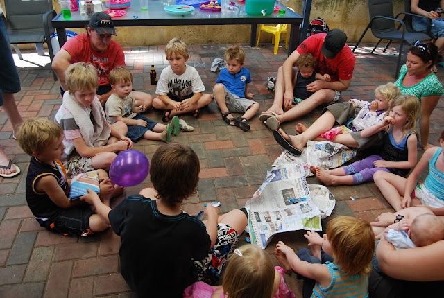 It's been a birthday party weekend so far. Yesterday afternoon was a party at a Water Park in Ellenbrook, and today was a party at a friends house. Sam looks pretty relaxed playing this game of Pass the Parcel... he actually won which was a very exciting moment for him :)
