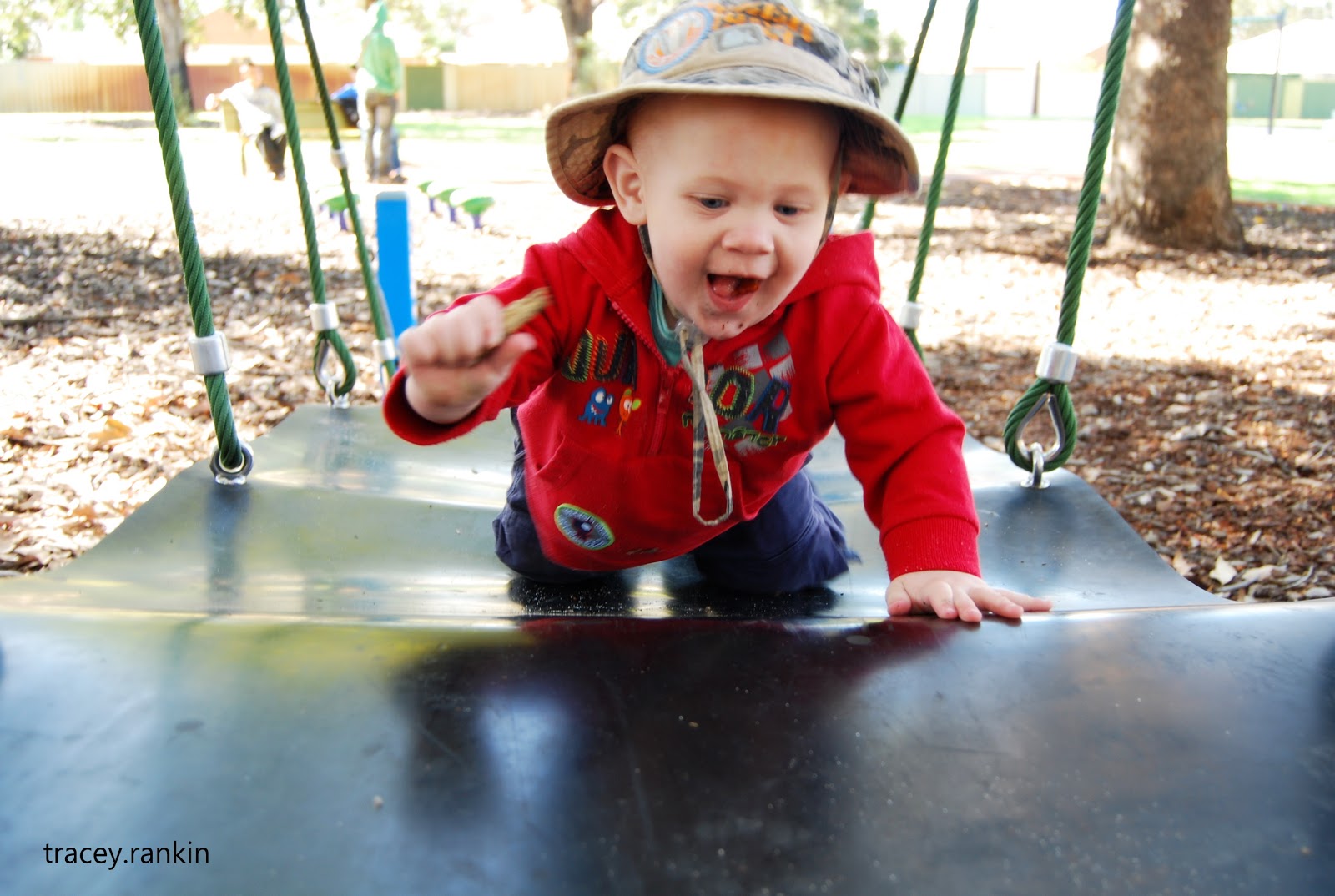 Check this out. 3 teenage boys came along and started climbing over the play equipment. See the guy right on top in the green jumper? And see Sam standing with Ted on the ground? Well Sam said to him "Get down, that's dangerous!" hehe Luckily the boys thought it was funny and ended up having quite the little conversation with him.