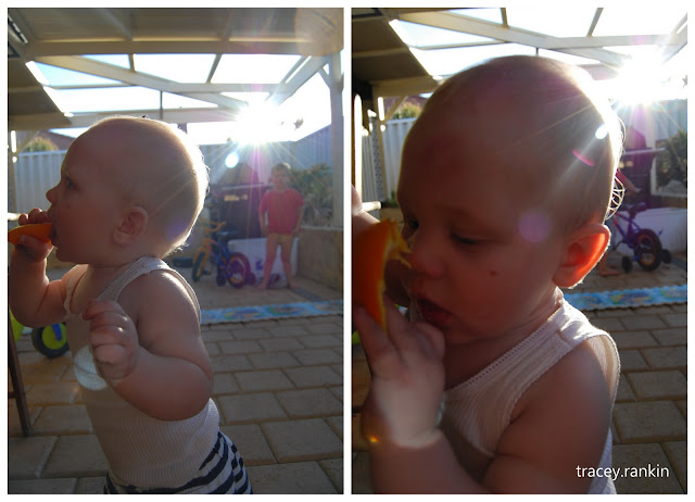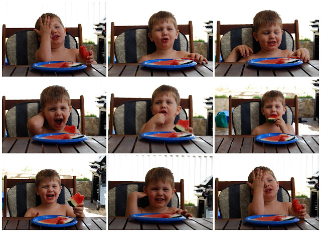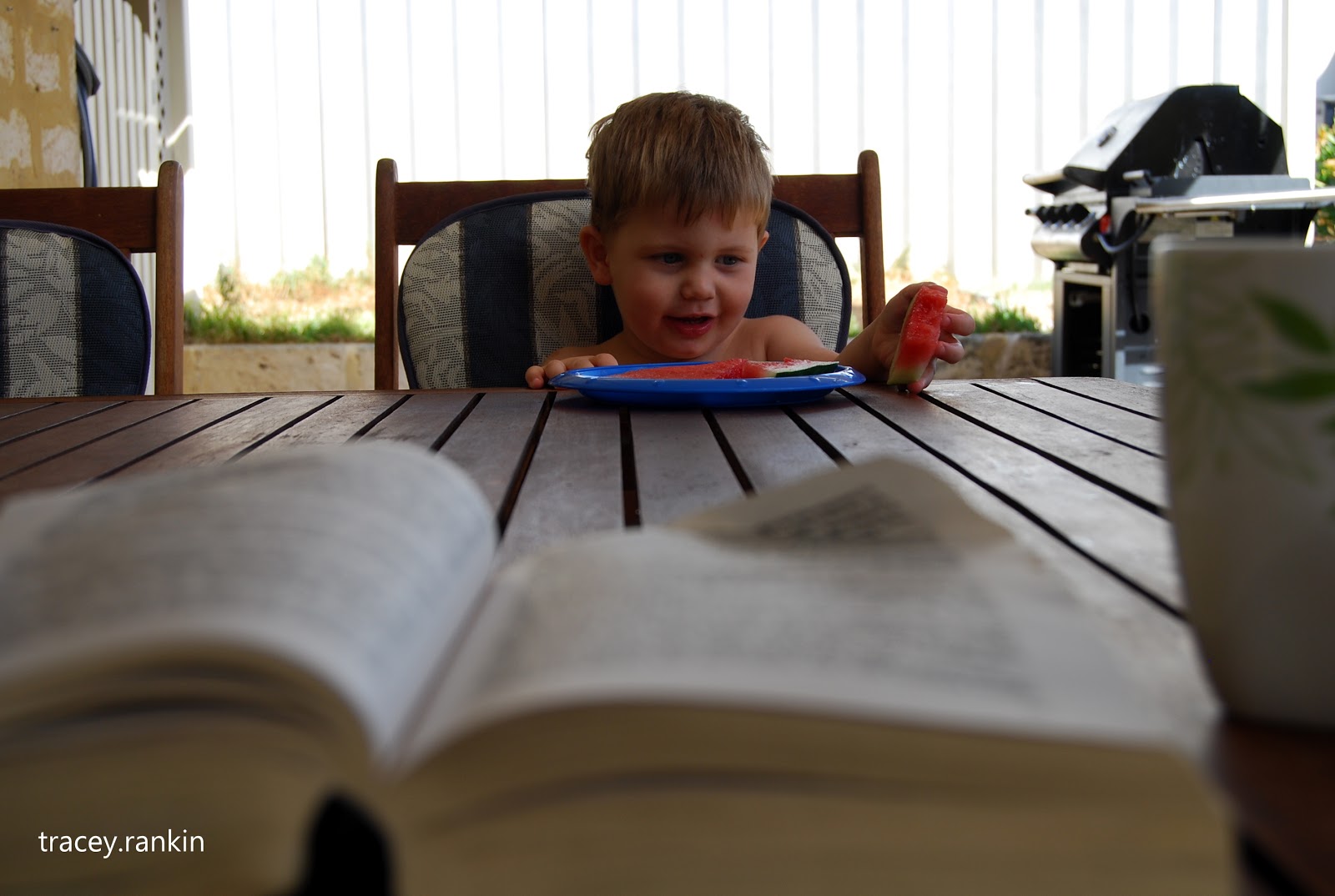 While Jacob was napping this morning, Sam and I spent some time outside... he was eating watermelon while I read some of my book and sipped on my cup of tea.