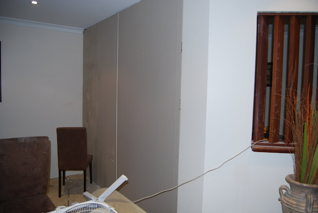 Insulation in, and all walls put up. Patching started... it's coming along nicely! Lewy is doing a great job.