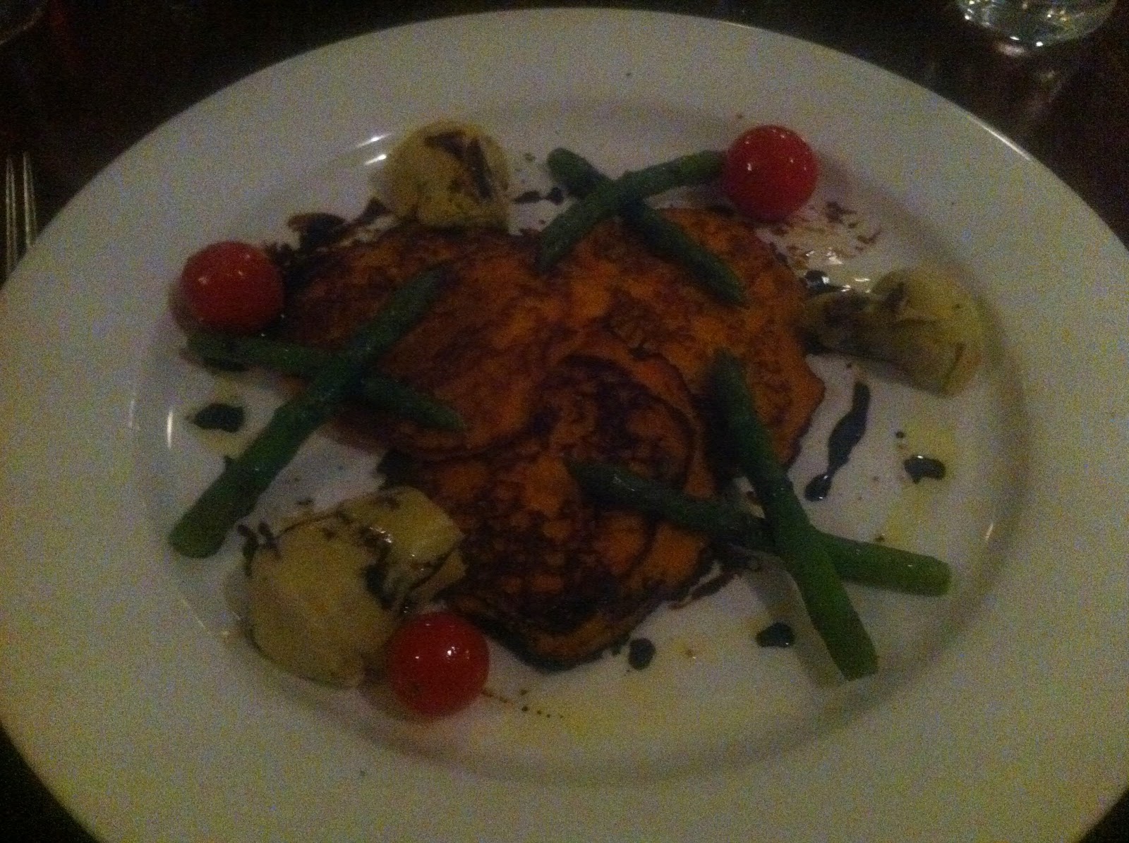 My Entrée - Sweet Potato and Pumpkin Bellini, with artichoke hearts, asparagus & cherry tomatoes... beautiful!