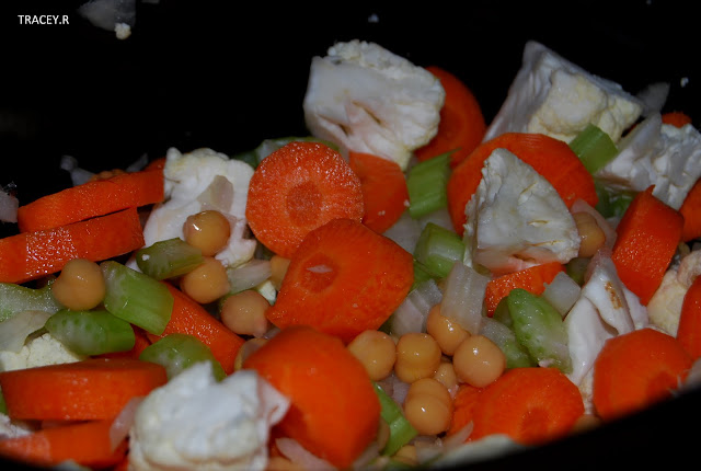 So... chop up whatever vegies you like.. I used onion, cauliflower, carrots and celery then added a can of chickpeas.