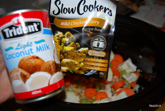 Add a can of Light coconut milk, and a recipe base for whatever curry you like... this mild chicken curry is yummy, I've also used a mild Indian beef recipe base as well and that is just as good.