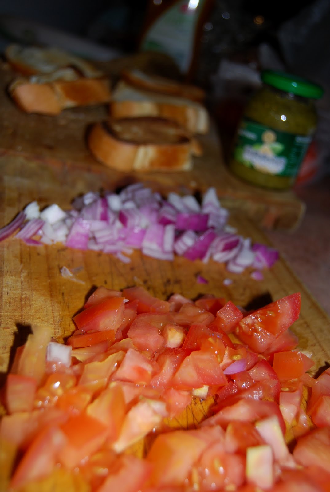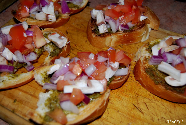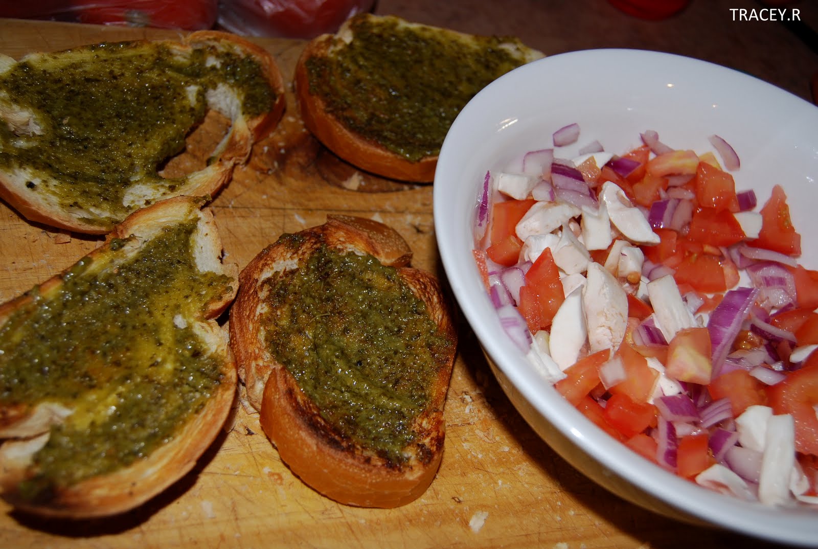 Bruschetta - toast both sides of a nice crusty bread. Spread on Basil Pesto (I love pesto so I do a nice thick layer :)