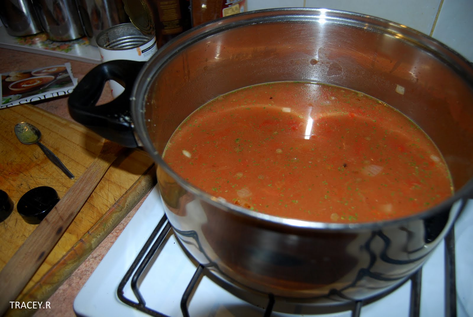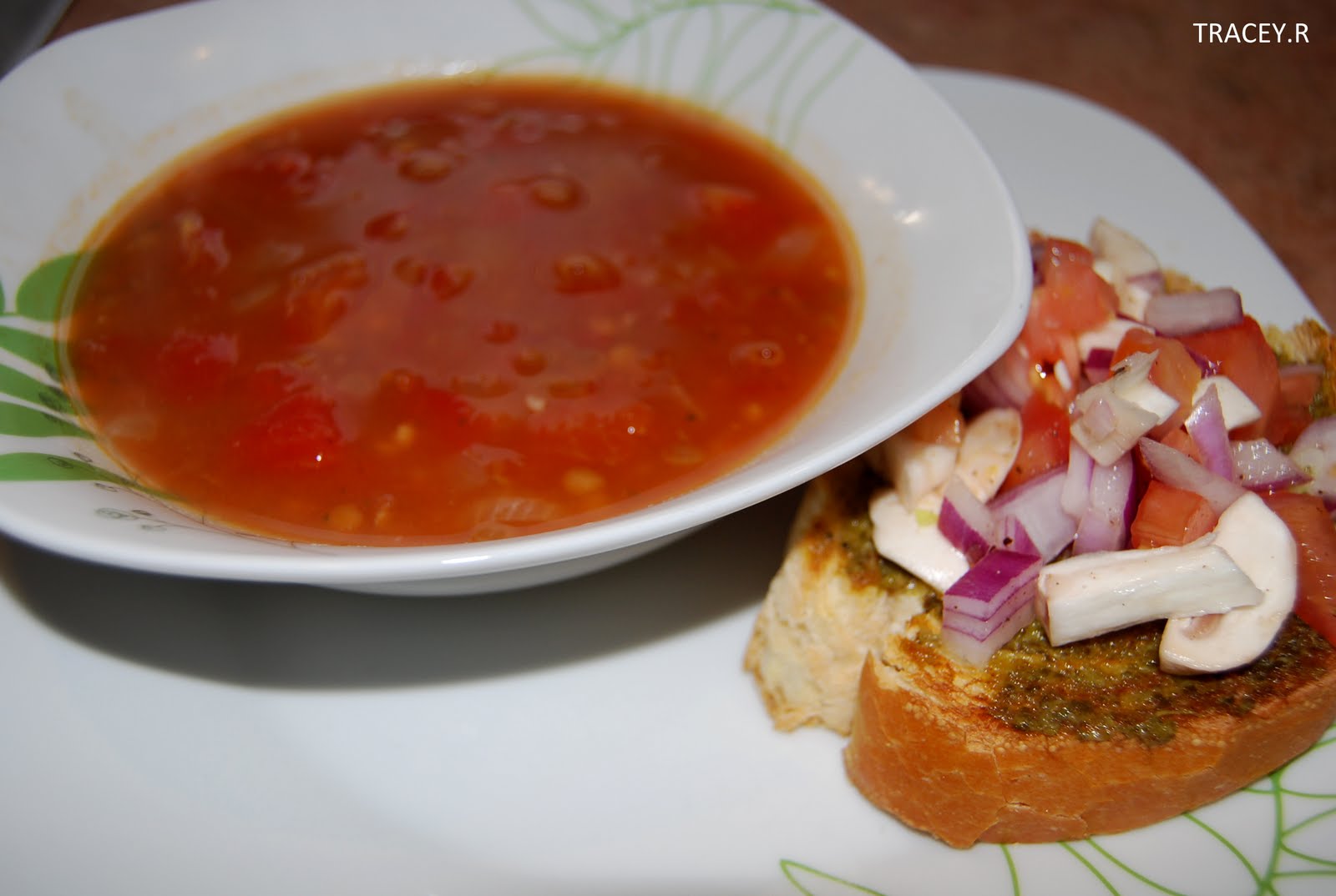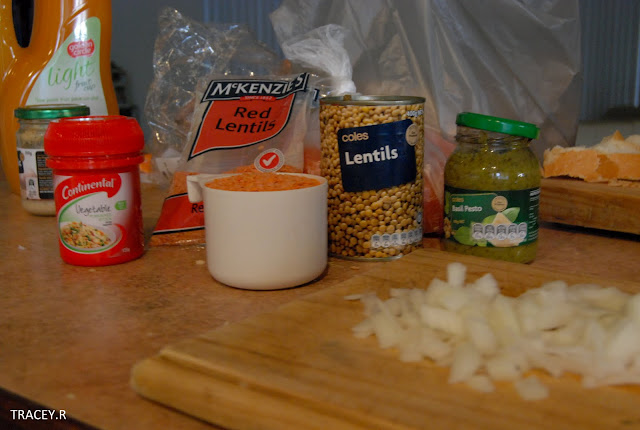 Stir in lentils (you can use either red lentils uncooked or else use a can of brown lentils), 400g can of diced tomatoes and 3 cups of vegetable stock. Bring to boil. (If you used red lentils, then simmer for around 10 mins or until lentils are soft.. if you used can of brown lentils, heat through and soup is ready!).