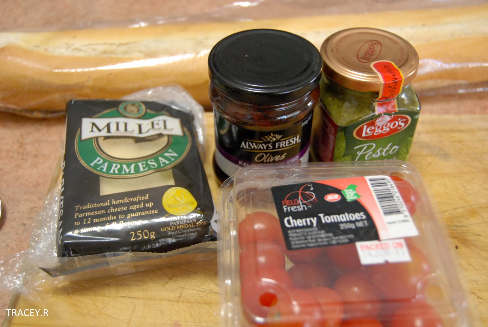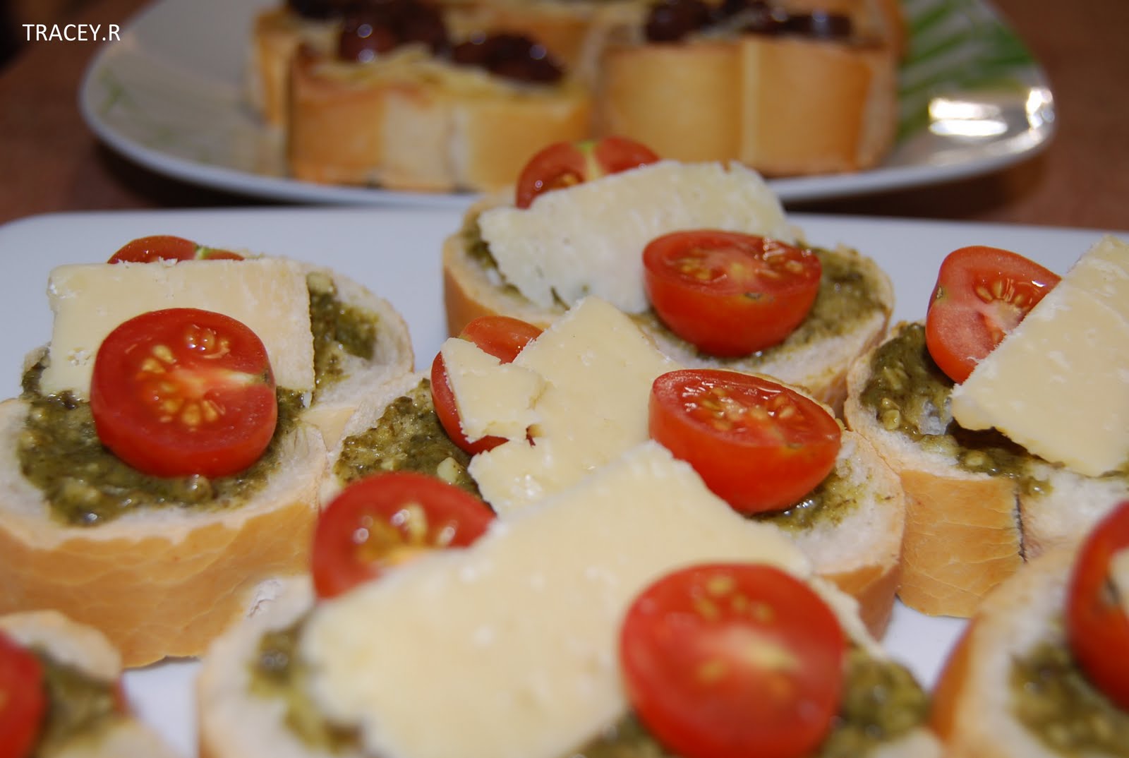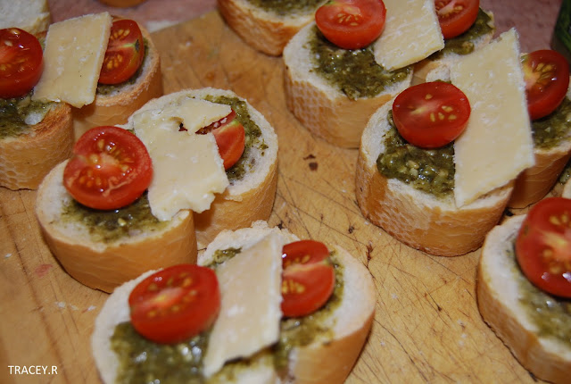 Basil pesto, cherry tomatoes & shaved parmesan.... yummo.