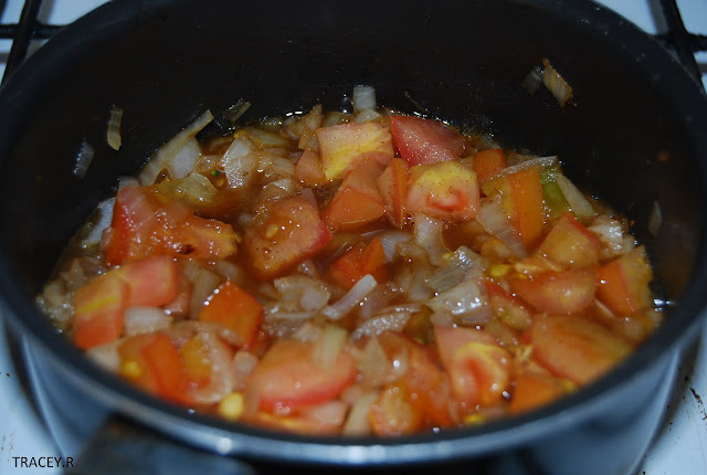 Add to a small saucepan - 1 chopped onion, 1 chopped tomato, 1 tablespoon vinegar, 2 tablespoons brown sugar, 1 teaspoon cinnamon. Simmer for the same time as it takes for your potato to bake. Man, this tastes gooooood. It's a nice contrast with the plain potato.
