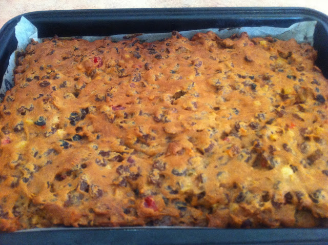 3. Grease pan (I use my big roasting pan as there is a lot of mixture) and line with baking paper. Pour mixture into pan and cook for 1 hour or more until cooked.