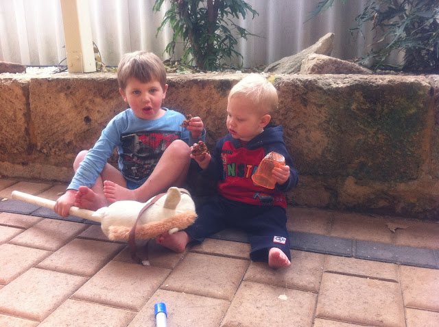 I gave my boys some of the mango fruit cake to try and they went outside to eat it .... I popped my head around the corner and saw this, I think they were enjoying it :)