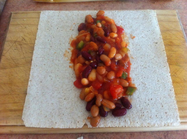 3. Place some of the bean mix in the middle of the wrap, wrap it and put on baking tray.