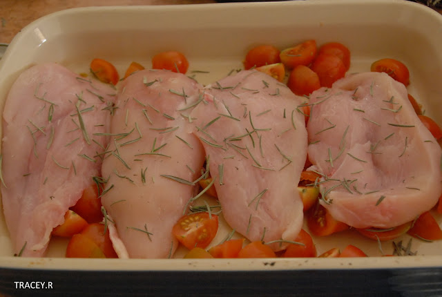1. Put the cut cherry tomatoes on the bottom of the casserole dish