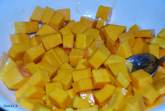 2. Preheat oven to 180, place pumpkin into bowl and add honey and oil - toss to combine. Place onto baking tray and roast for 25 - 30 minutes. Set aside to cool.