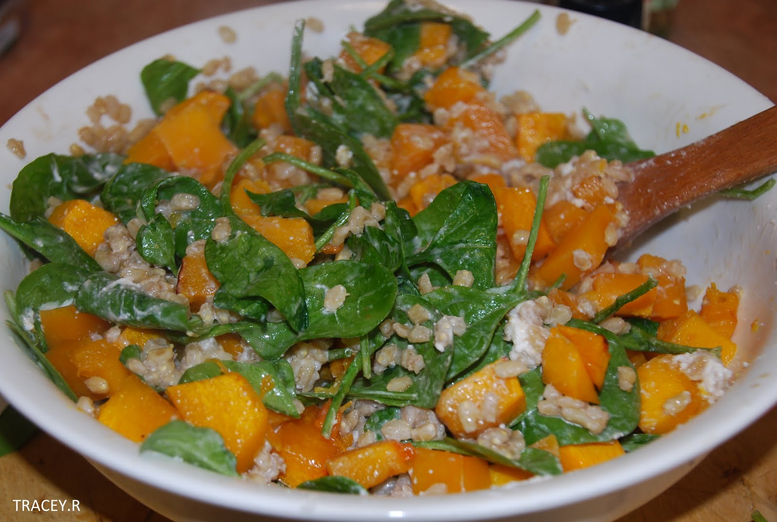 3. Make dressing - place oil and vinegar in bowl, season with salt and pepper and whisk to combine. Add pumpkin, spinach, cheese and barley - toss to combine.