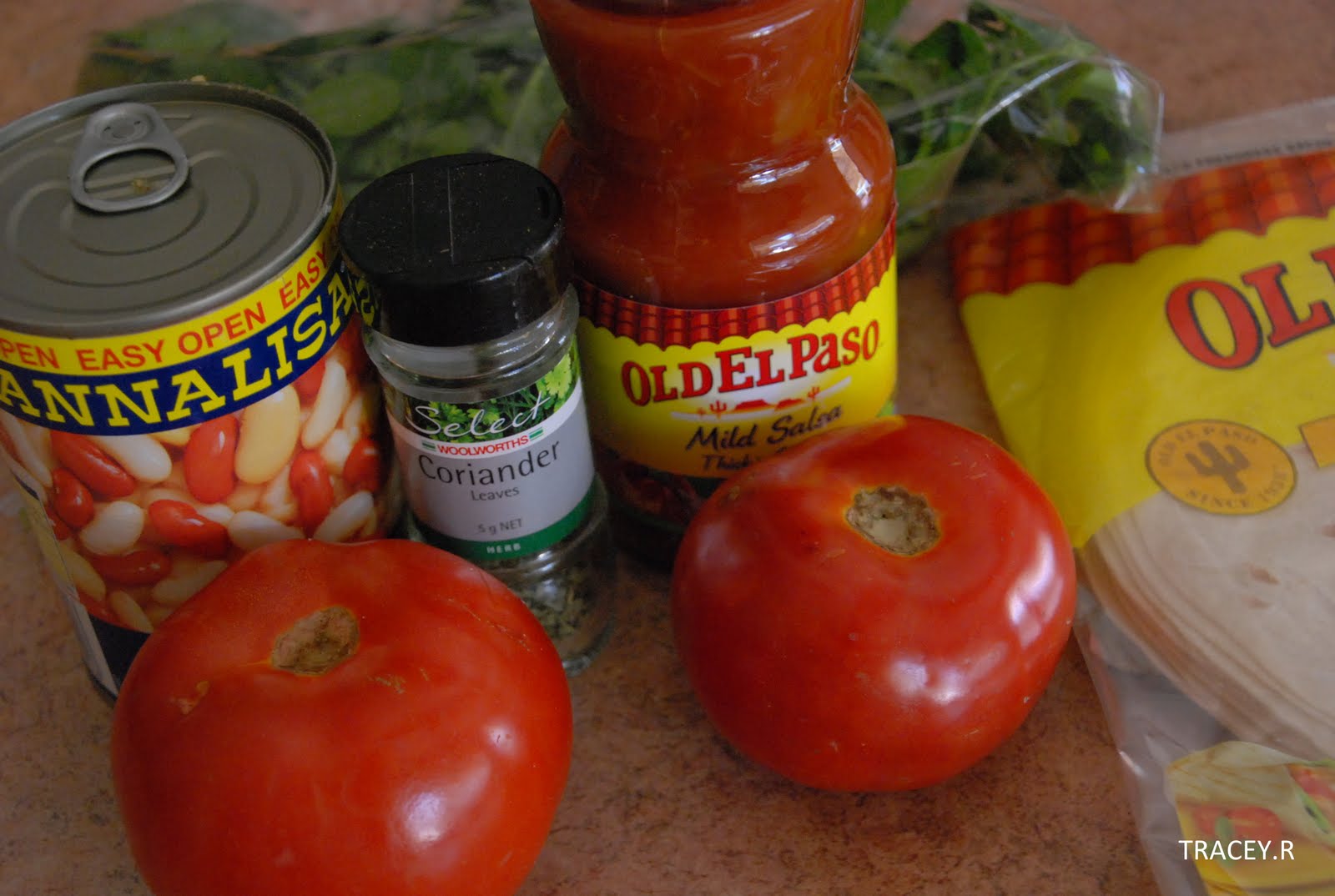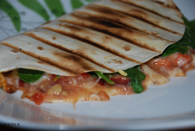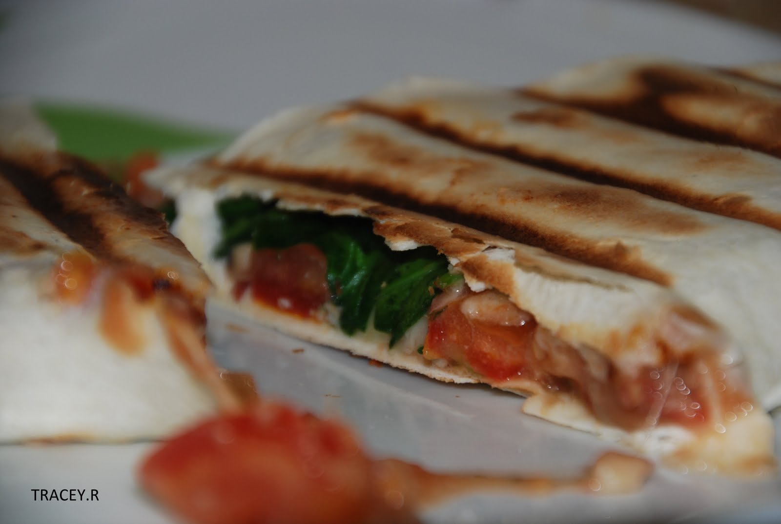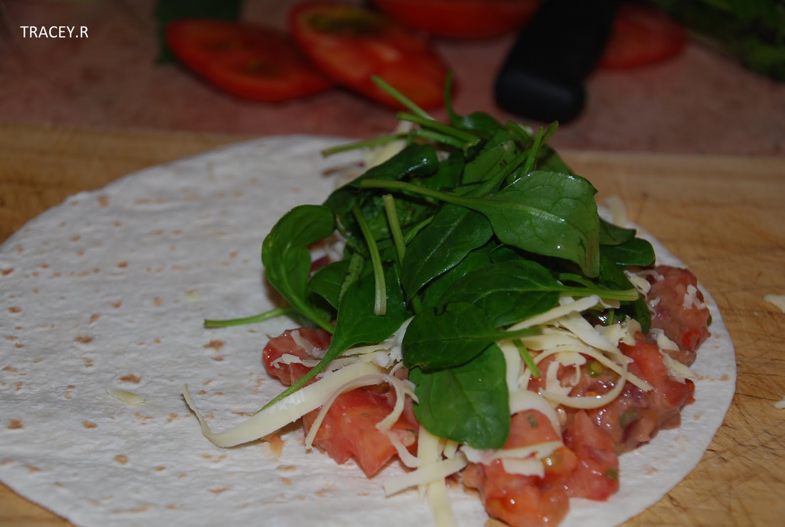 3. Place some mixture onto half of a tortilla and top with cheese and baby spinach. Fold over and put into toaster/griller/frypan, whatever you like just to brown and melt the tortilla.