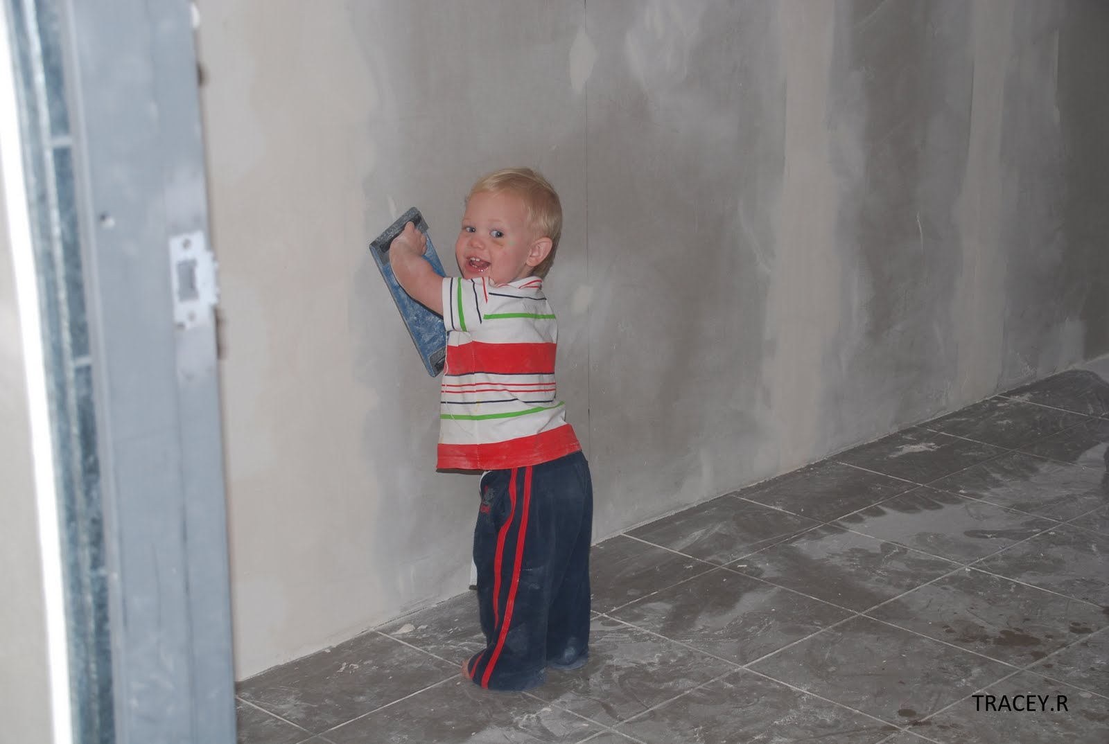 While I was vacuuming, I walked past the room to see THIS! He was actually copying what I had been doing and sanding.... way too adorable! Thanks for your help buddy!