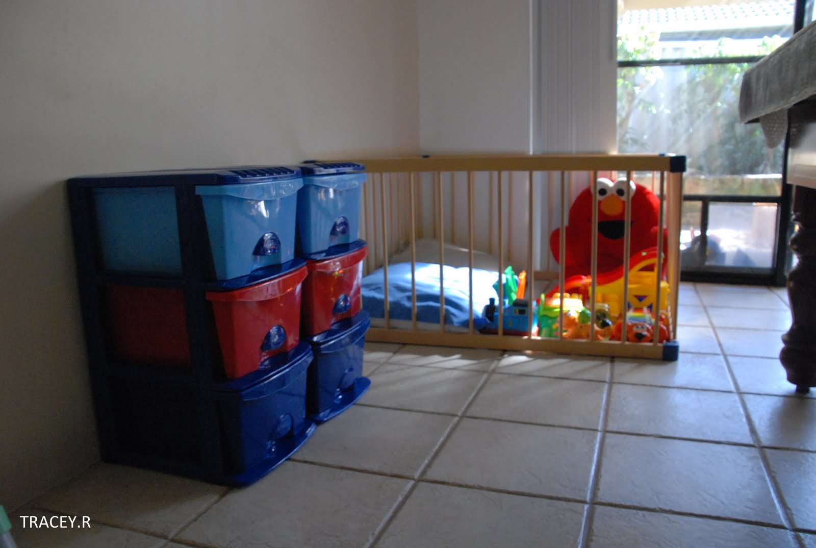 Next issue to tackle - the boys play area. Before, all their toys were in baskets and open containers, which meant that often they'd come up and tip them out and move on. Leaving a huge mess every day and it was exhausting trying to keep on top of it. So I bought these containers (again from K-Mart, $19) and set the rules that the boys can play with the toys inside, but the drawers can't be taken out and moved around the house and once they have finished, they must put them away before they get the next lot of toys out. I had a little giggle to myself when I overheard Sam explaining the rules to Jacob, very seriously and making sure Jakey adhered to the rules!