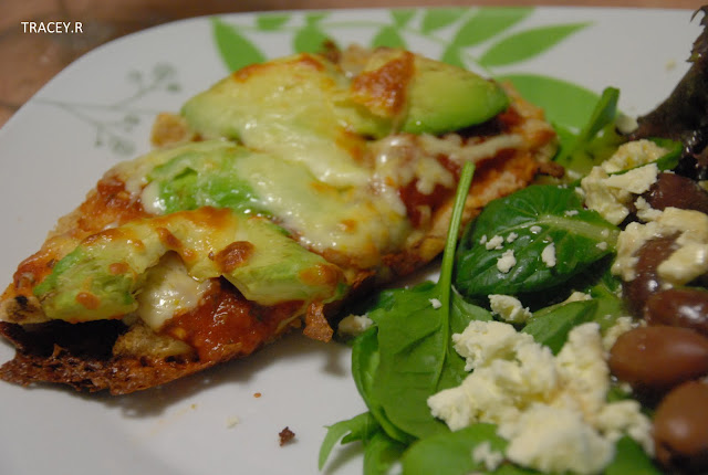 5. Top with 1 heaped tablespoon of pasta sauce, arrange avocado over sauce and sprinkle with cheese.