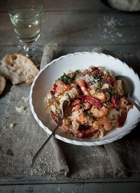 Oh yes please... prawns, roasted tomatoes, fettuccine, basil, parmesan. Drool!
