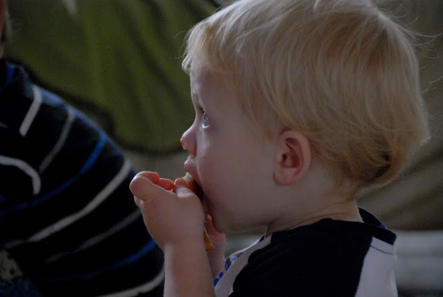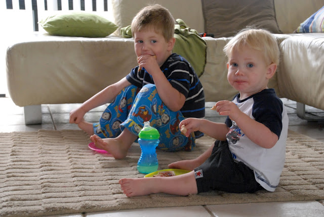 Sunday morning treat... having breakfast on the rug while watching cartoons.