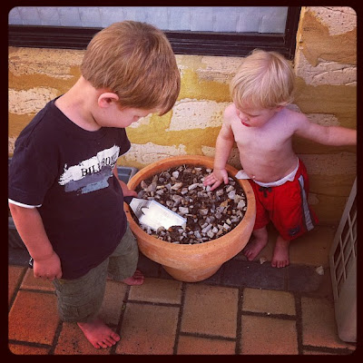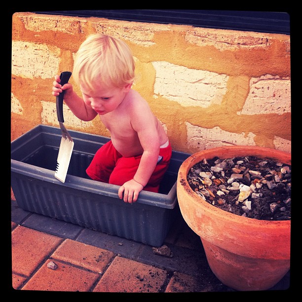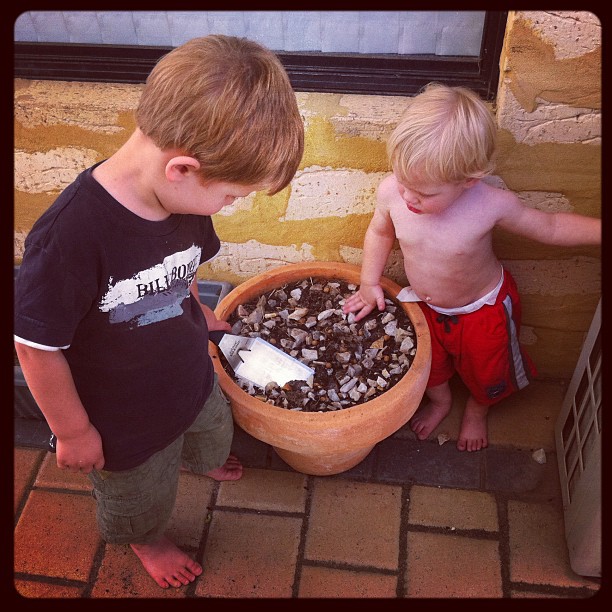 Amazing how an old pot with dirt and rocks in it, together with a BBQ utensil thingy can provide loads of entertainment!