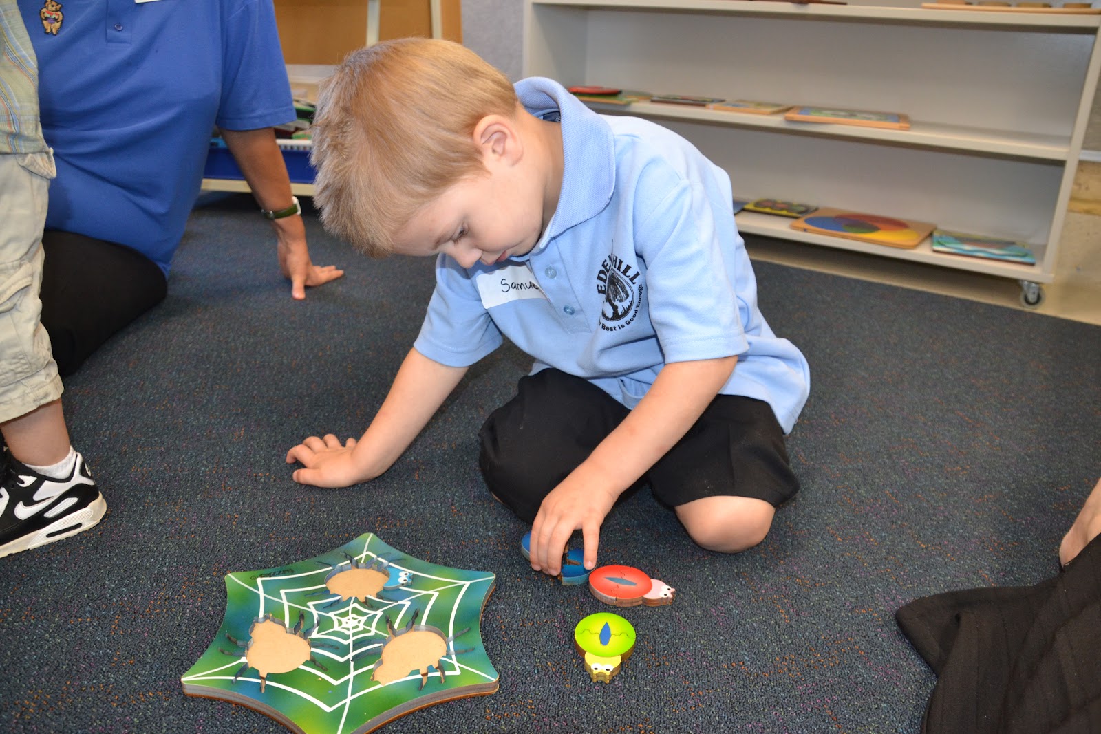 Puzzle play with kids and parents, before we were shipped out of the room so they could start class.