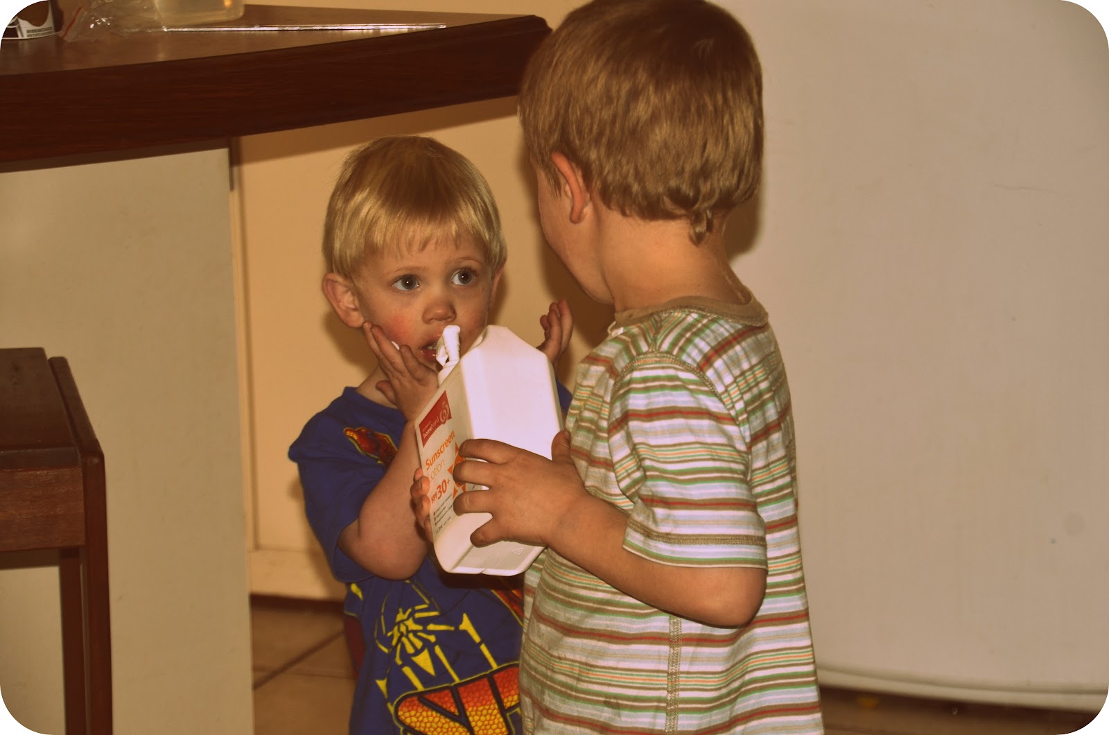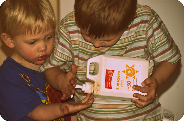 Unbelievably cute, Sam showing Jacob how to apply sunscreen. Clearly they are concious of skin care and the sun's dangers :P Sweet or what!