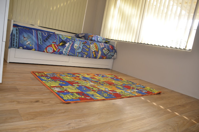 Room complete with fresh paint, new flooring, new rug, doona cover, sheets, blanket, toy box, and chest of drawers. More to follow - but I think we've done pretty well for now.