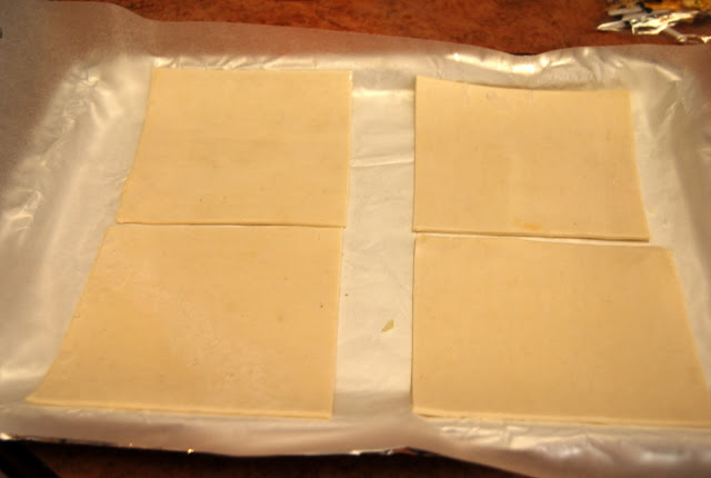 2. Cut the puff pastry into quarters, and place on tray with baking paper.